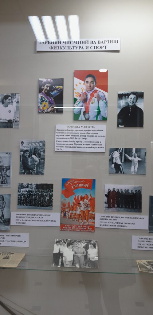 Ein paar spannende Episoden gab es dann doch noch. Im National Museum of Antiquities of Tajikistan war die Ausstellung zwar sehr konfus, der liegende Buddha aus einer Ausgrabung dann aber eine willkommene Überraschung. Zudem habe ich ein paar tadschikischen Schülern eine Freunde gemacht indem ich mal wieder die vorher, wohin, wie findest du das Land Fragen beantwortet habe. Dann gab es noch eine Fotosession inklusive Videoaufnahme in der erklärt wurde wer ich bin und was ich hier mache. Dann durfte ich auch noch was sagen. Habe natürlich den Klassiker gebracht, dass ich Tadschikistan sehr schön finde und die Menschen sehr nett. Stimmt sicherlich auch wenn ich nur etwas mehr von Land hätte kennenlernen können. Die drei haben sich aber natürlich sehr gefreut. Eigentlich sollte in dem Museum auch das Ethnologische Museum untergebracht sein. War es aber leider nicht. Zufällig bin ich dann aber zwei Tage später in einem ganz anderen Stadtgebiet darauf gestoßen. Für einen Euro Eintritt war die Ausstellung ganz gut. Erstaunlicher fand ich allerdings den Raum der herausragende weibliche Persönlichkeiten ehrt. Hatte ich zugegeben nicht mit gerechnet in Tadschikistan. Leider war die Beschriftung hier nur auf russisch, so dass ich nur von den Bildern auf deren Errungenschaften schließen konnte. Einige Sportlerinnen, aber auch einige andere.